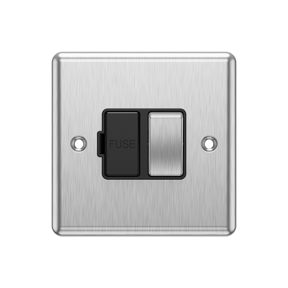 Elevate your space with the stylish and practical 1 Gang Switch Fused Spur Unit in Brushed Chrome with a Black Insert. This contemporary electrical fitting blends functionality with a modern aesthetic, perfect for any home or office. The brushed chrome finish paired with the sophisticated black insert not only adds a touch of elegance but also provides a durable and reliable solution for controlling your powered devices.