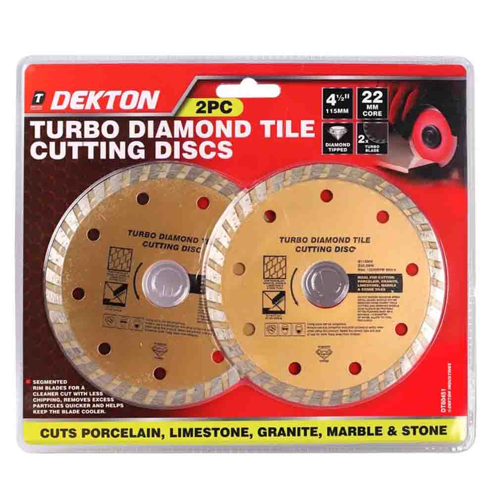 The Dekton 2pc 115mm Diamond Tile Turbo Disc Set is highly versatile and can easily slice through ceramics, granite, marble, and other hard materials, without any hassle. This makes it a favourite tool for a wide range of tiling and masonry tasks.