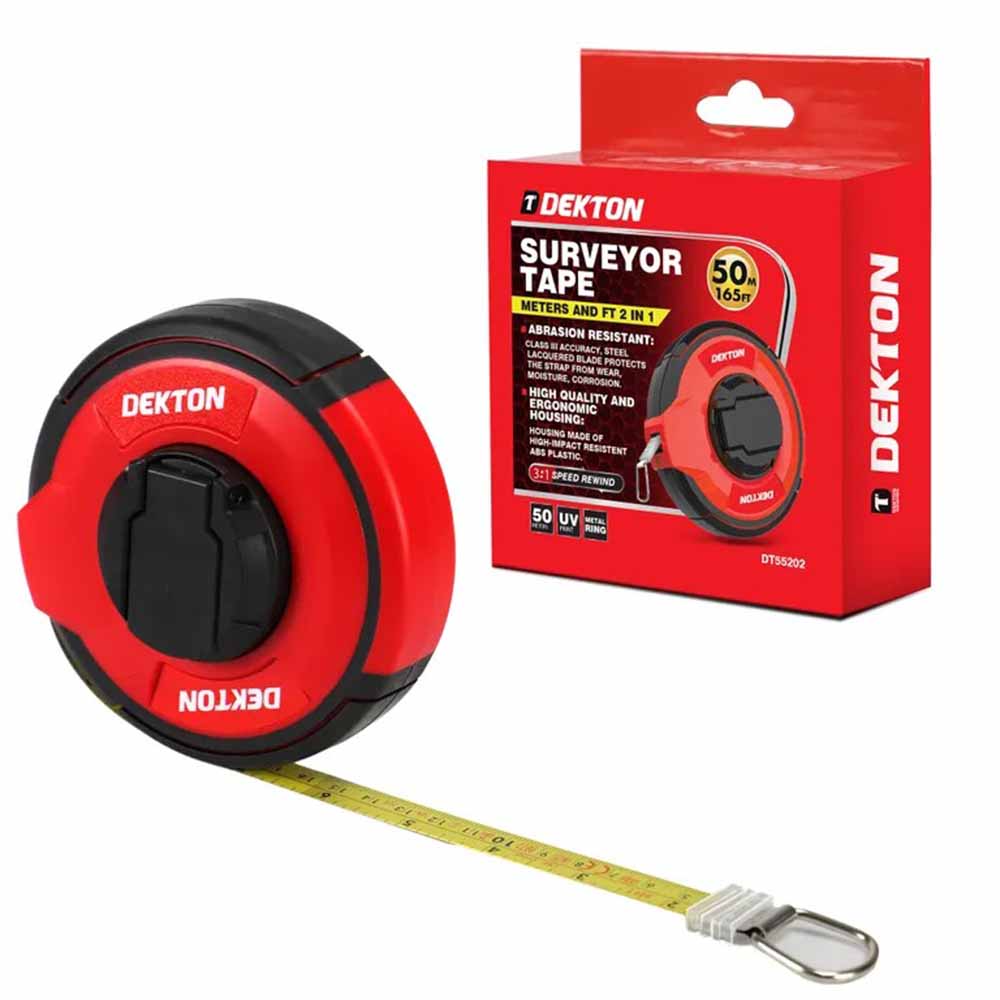 The Dekton 50m Surveyor Tape Enclosed is designed with the user in mind. The ergonomic grip offers comfortable handling, while the smooth rewind mechanism allows for quick and easy tape retrieval. Plus, the lightweight design makes it easy to carry around, whether you're on the job site or working on a DIY project at home.