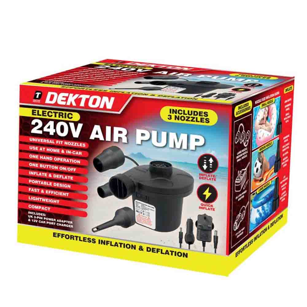 Experience the convenience of quick and easy inflation with the Dekton Electric Air Pump 2 in 1. This compact and powerful device is designed to inflate and deflate a wide range of items, from air mattresses and inflatable pools to balloons and much more. Its versatile design enables you to handle both tasks efficiently, saving you time and effort.