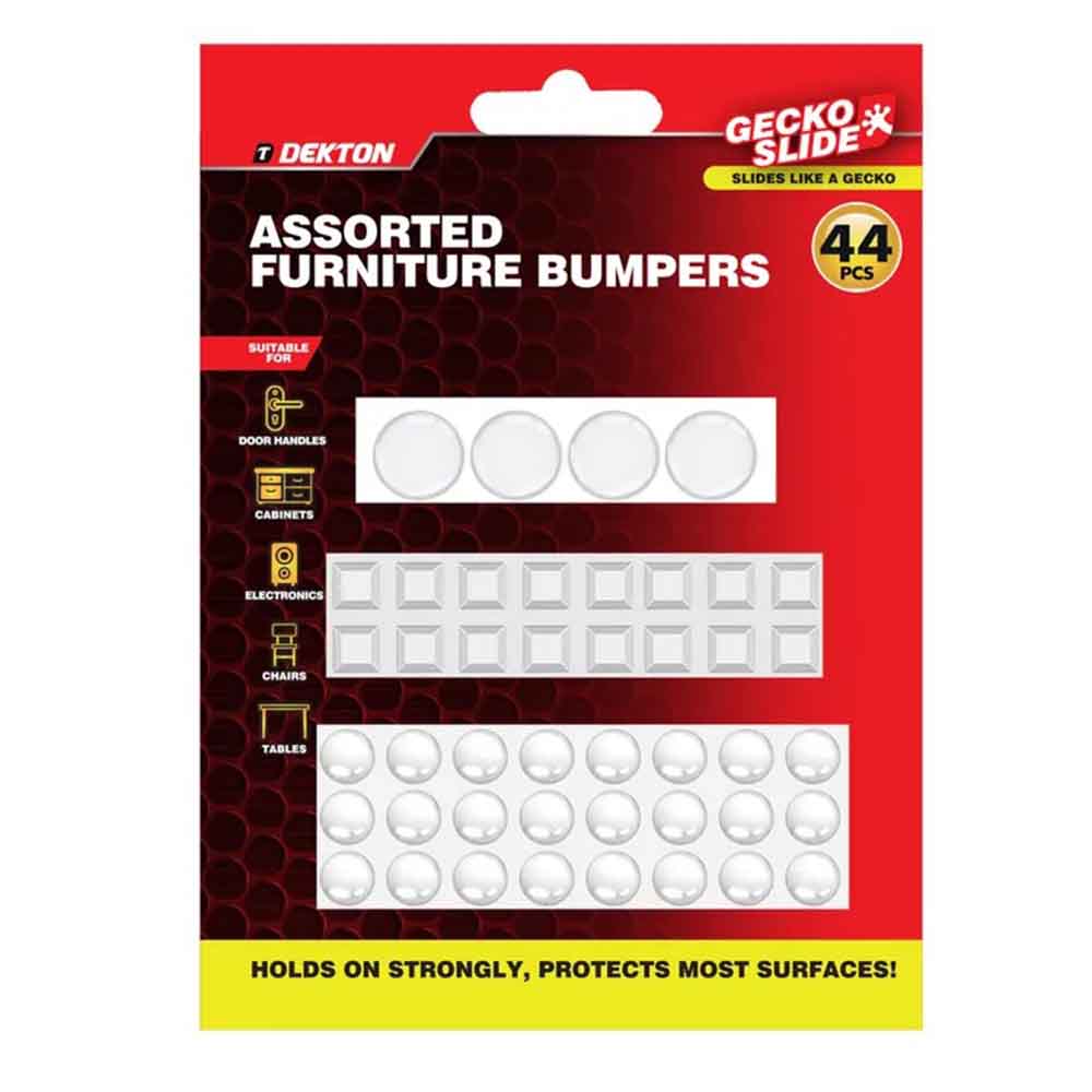 Introducing the Dekton Geckoslide Assorted Furniture Bumpers, your one-stop solution for protecting your furniture and flooring. This 44pc set offers a variety of shapes and sizes to suit all your furniture needs. Made from premium materials, these bumpers are designed to provide optimum protection against scratches, dents, and noise caused by moving furniture.