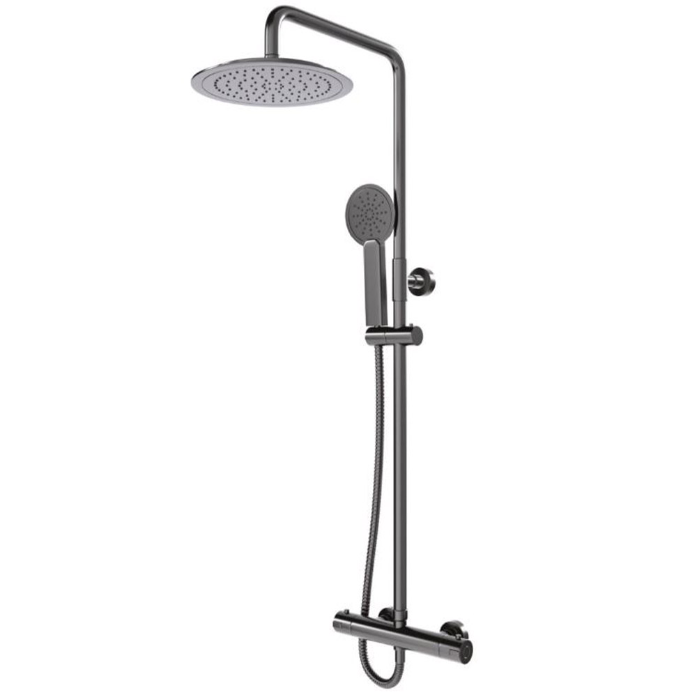 Incorporate elegance, comfort, and safety into your daily routine with the Mendi Round Thermostatic Bar Valve C/W Shower Kit in Gun Metal. Order now and transform your bath time into a luxurious experience!