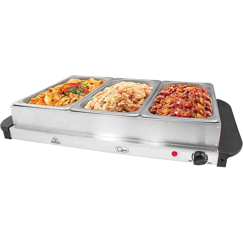 Designed with your needs in mind, the Quest Large Buffet Server & Warming Plate boasts a robust, stainless steel construction for longevity. It includes three large pans and lids, providing plenty of space for a variety of dishes.